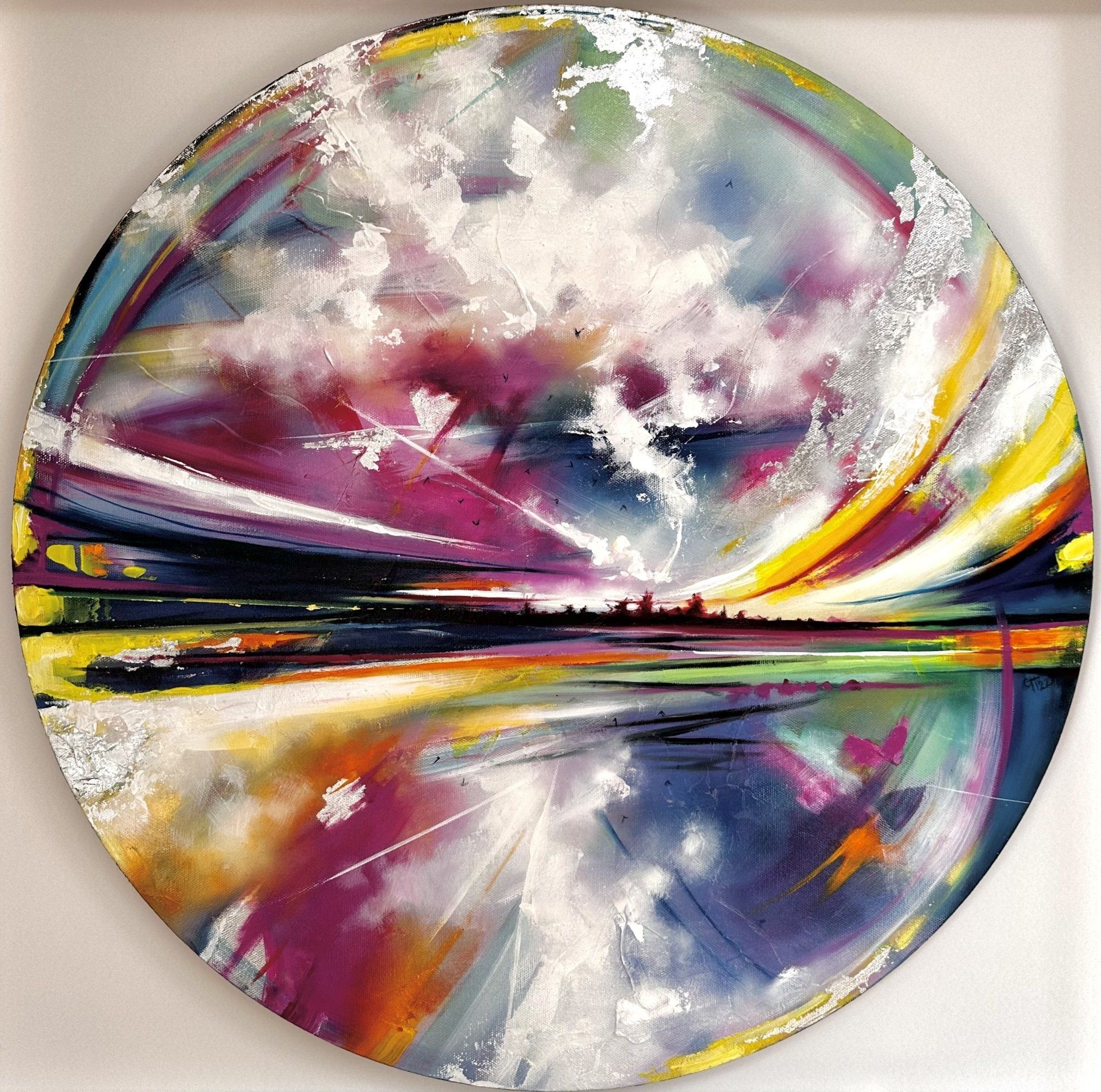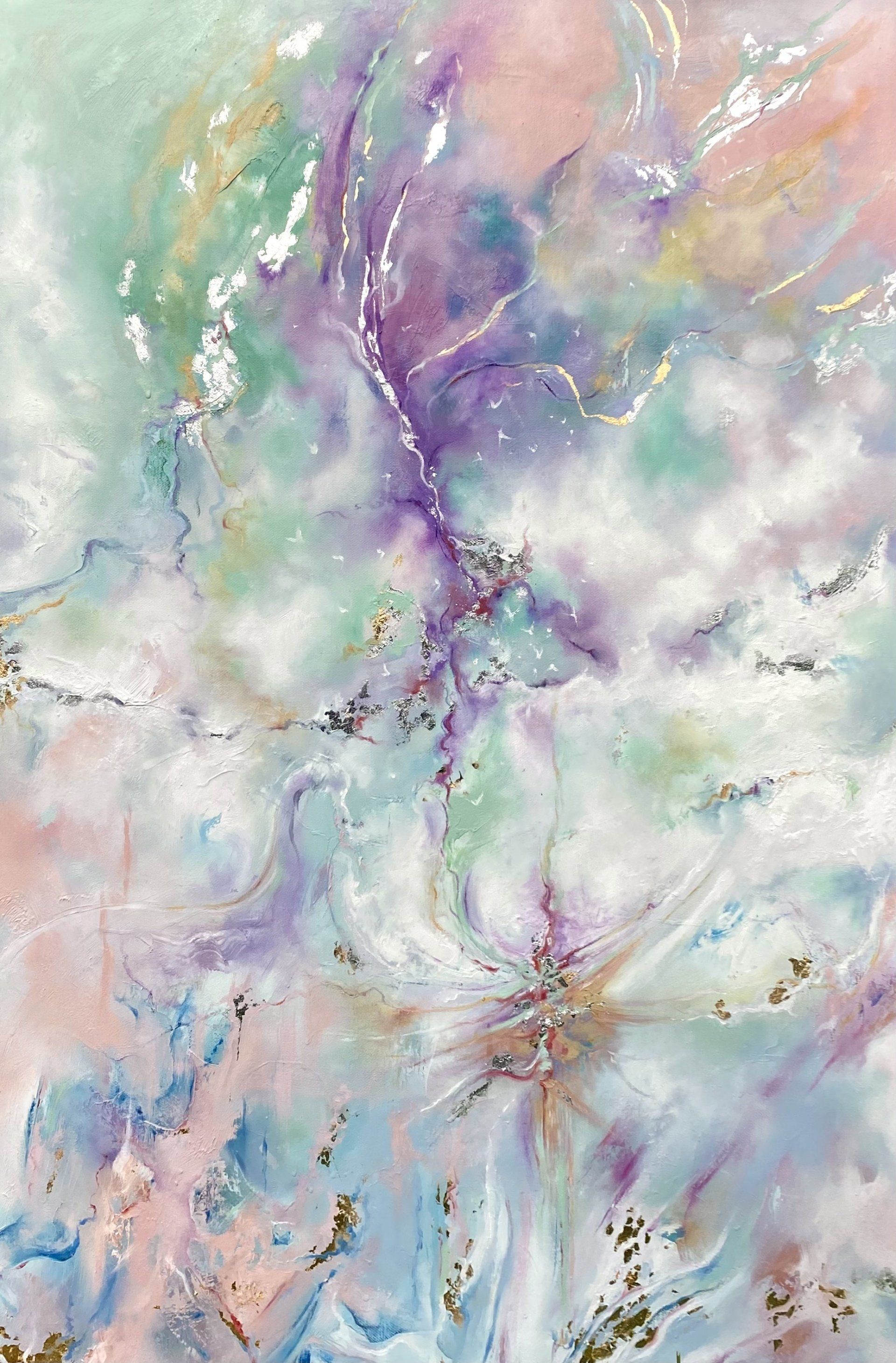 Acrylic pour base painting with added oil paint and gold and silver leaf to refine and embellish.