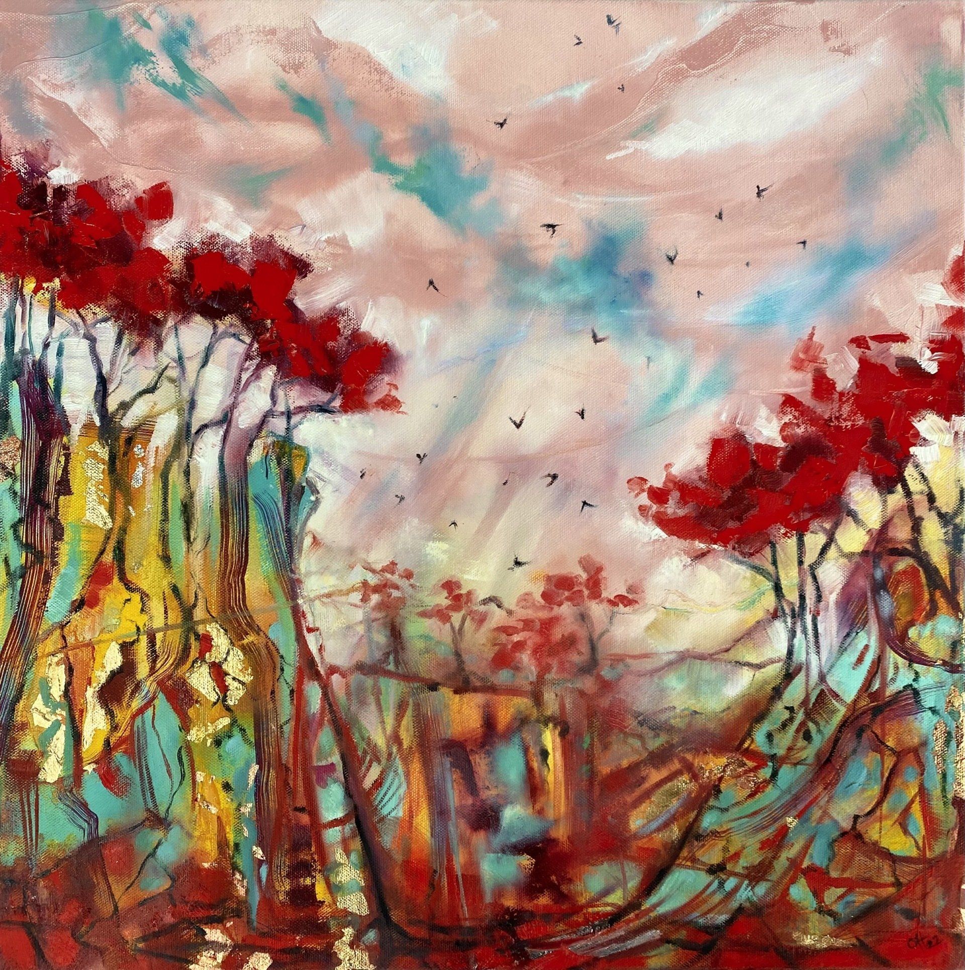 Not one for using a limited palette I feel the addition of pink, orange and yellow and finally glints of silver leaf added even more energy to the scene.